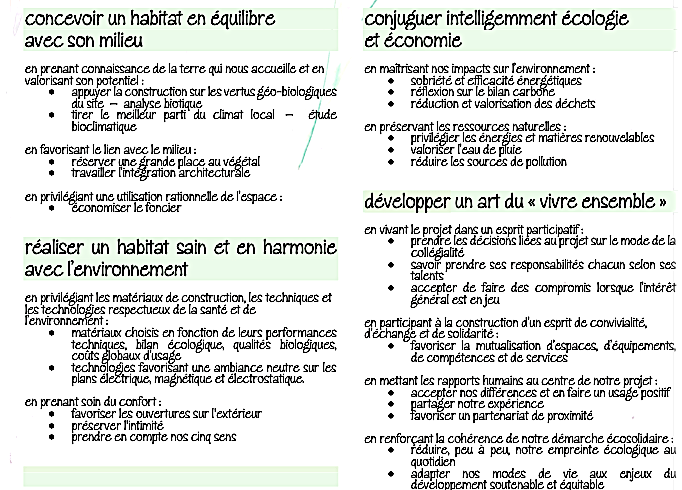 Pour le groupe de futurs habitants, la première approche, vivement conseillée, consiste à définir ensemble une charte éthique et les grandes lignes qui fondent le lien social, ainsi que les méthodes de prises de décisions collectives au sein de l’équipe des futurs copropriétaires.